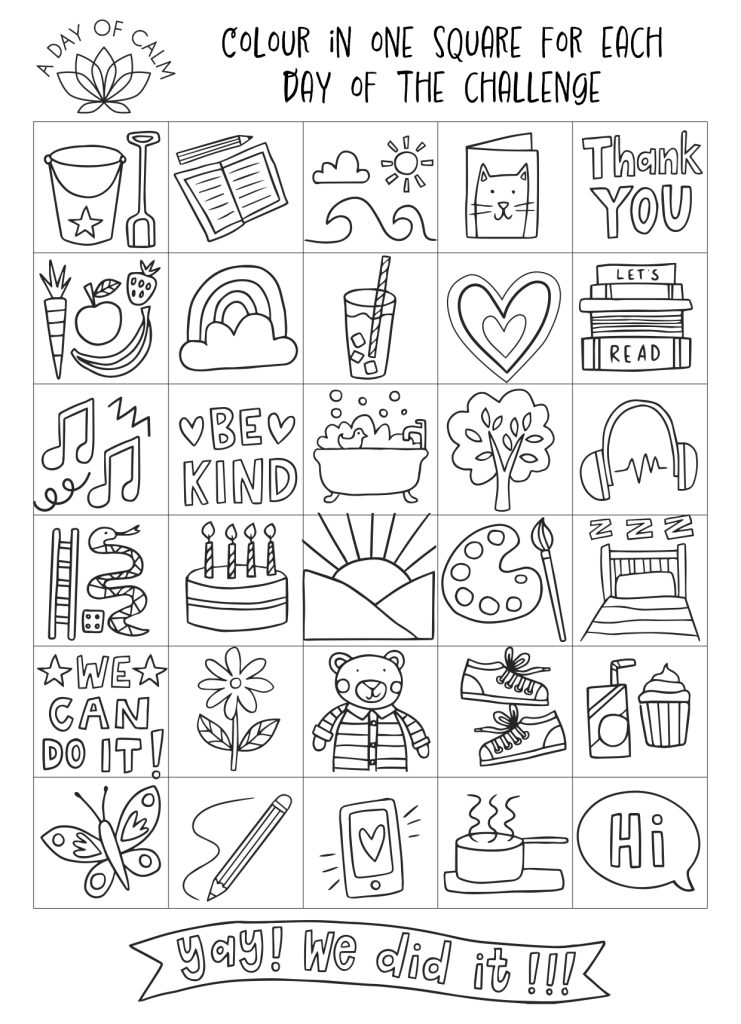 The best bit is there are printouts you can add to your fridge and tick off as you complete them. I also have a separate colouring-in sheet of the challenge for the younger members of your family to colour in, although having said, this colouring is calming, so everyone in the family may want their own sheet.